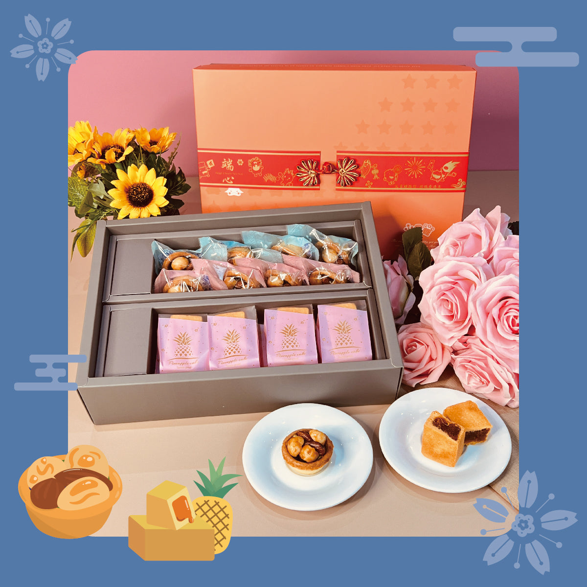 | 商品規格: | 鳳梨酥8入/盒,堅果聚塔8入/盒;禮盒尺寸 305*215*75(mm)/外盒 |