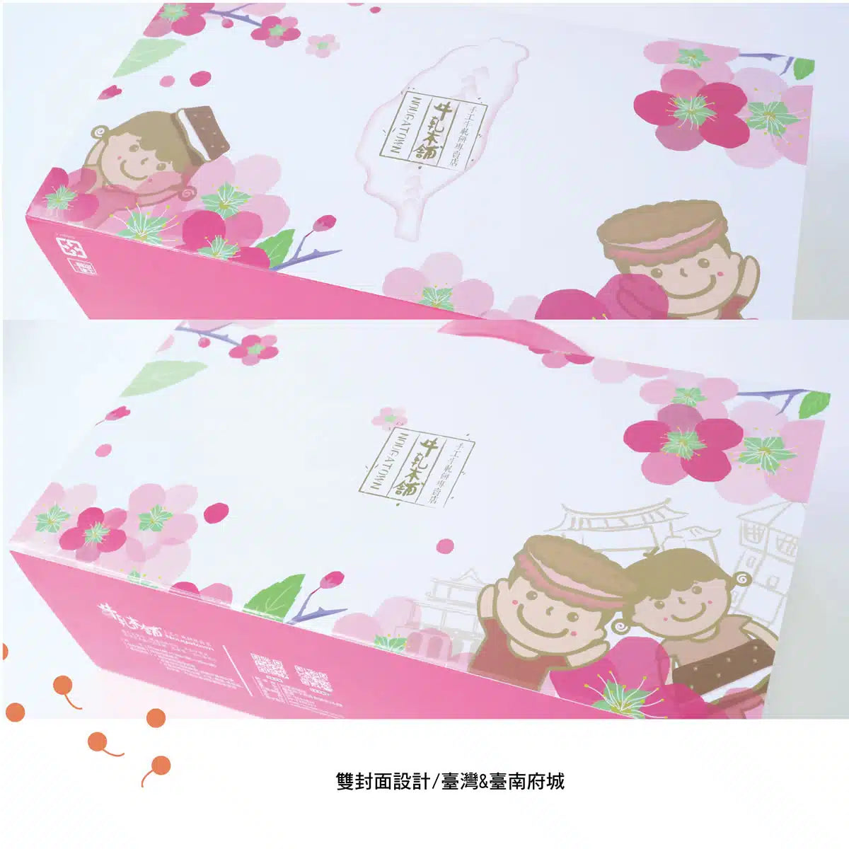 提繩盒設計,一側畫有台南府城代表性古蹟,安平古堡、孔廟、赤崁樓等圖案,另一側畫著台灣島嶼的樣貌,極具台灣特色包裝設計。內含原味20片、蔓越莓10片、花生5片、咖啡5片,共40片裝,絕對是逢年過節、伴手禮的最優選擇。