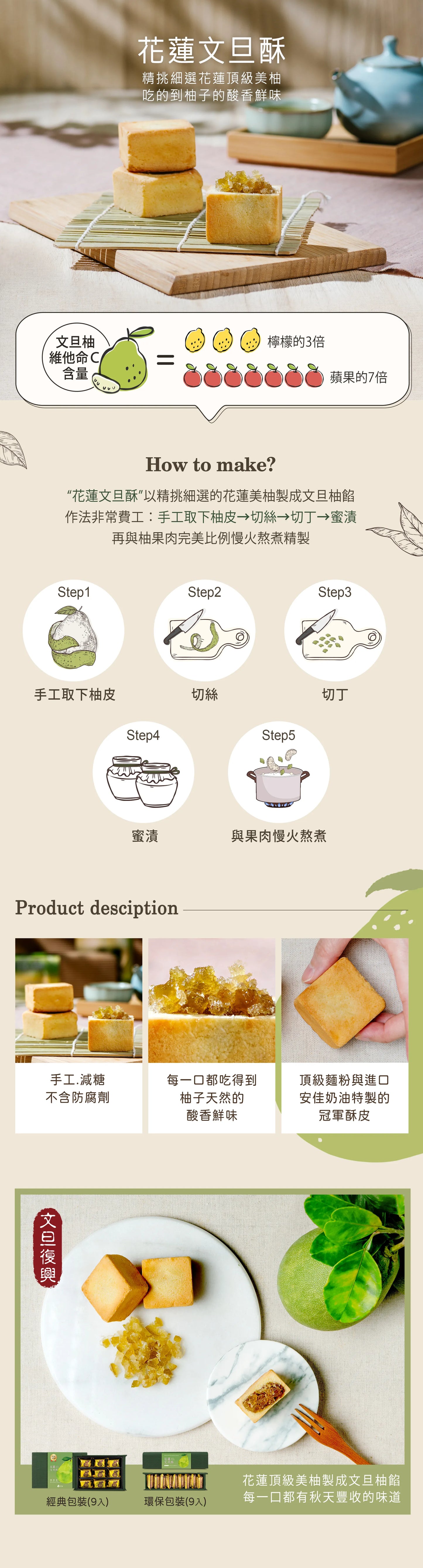 ▪ 成分:柚子醬(文旦絲〔文旦、砂糖、麥芽糖、食鹽、檸檬酸、檸檬酸鈉〕、文旦丁[文旦果皮、砂糖、麥芽糖、食鹽、檸檬酸、乳酸鈣]、麥芽糖、砂糖、冬瓜、棕櫚油、食鹽、檸檬酸、品質改良劑[多磷酸鈉])、麵粉、奶油、糖粉、雞蛋、卡士達粉(玉米澱粉、食鹽、著色劑〔食用黃色4號5號7號〕)、乳酪粉(乳酪、乳固形物、調味劑〔檸檬酸〕)、食鹽、紫心薯粉。