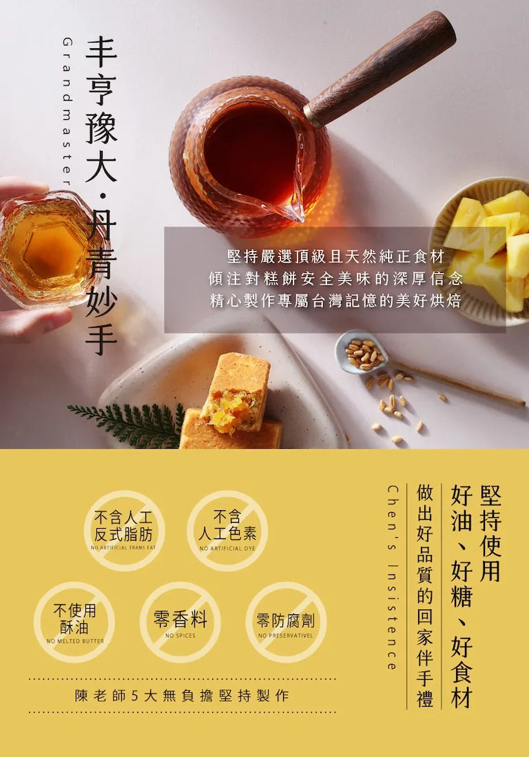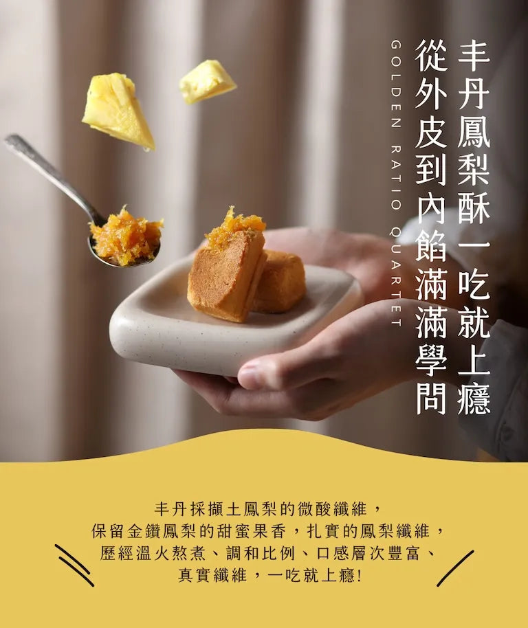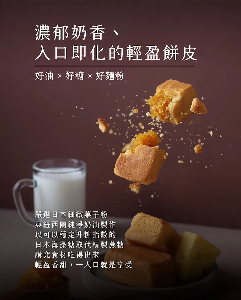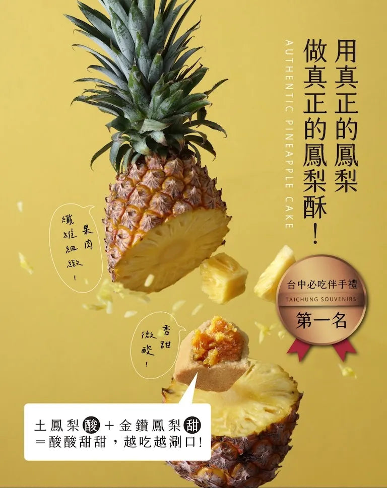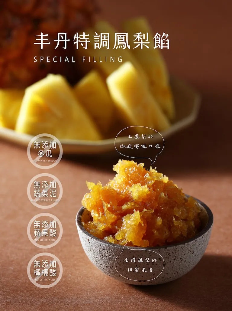特色: 選用臺灣在地土鳳梨+金鑽鳳梨,意在綜合其甜度與酸度,完全不添加蔬菜泥。外皮選用日本昭和菓子粉,細膩的口感入口即化,使用紐西蘭奶油的酥皮,奶香濃郁,酥而不油膩,酸酸甜甜的口感無可取代,食過便知。
