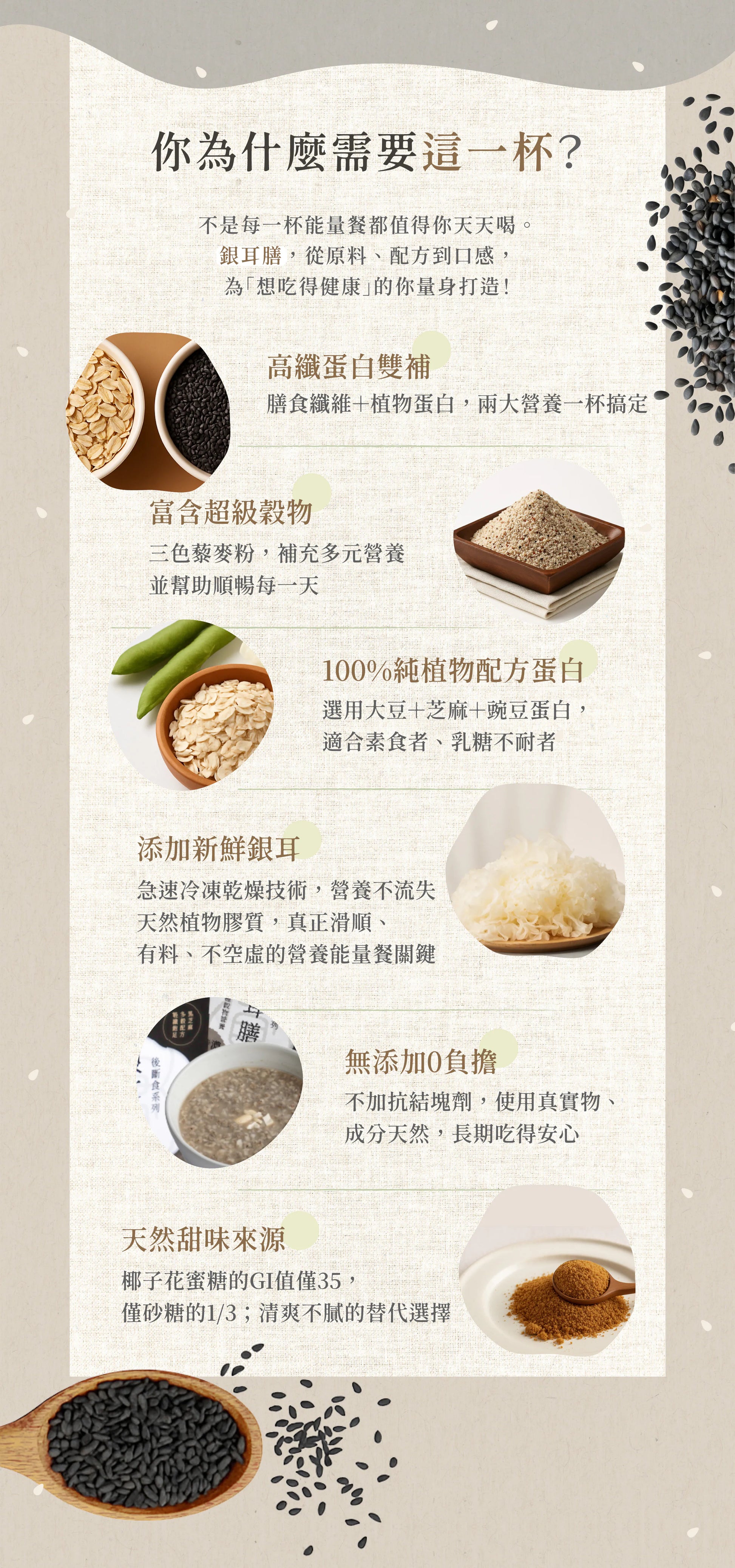 內容物: 豆分離蛋白(大豆分離蛋白、卵 磷脂)、難消化性麥芽糊精、芝麻 蛋白、椰子花蜜糖、燕麥粉、豌 豆蛋白、麥芽糊精、玉米澱粉、 乾燥銀耳、黑藜麥粉、白藜麥粉、紅藜麥粉。